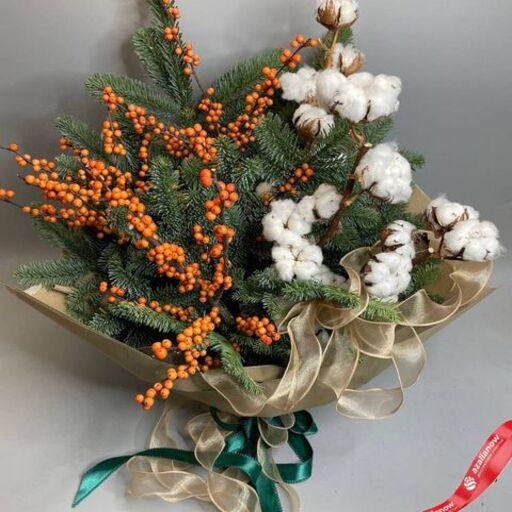Один из самых популярных трендов — зимние букеты с натуральными элементами. Например, зимний букет с хлопком и илексом выглядит уютно и идеально вписывается в новогоднюю атмосферу.