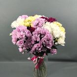 Букет из 15 кустовых хризантем — это настоящий вихрь красок и радости, словно летний сад, пробудившийся после теплого дождя. Нежные и пышные, словно облака, лепестки рассыпаются во все стороны, создавая чарующую игру оттенков. Этот букет напоминает волшебную поляну, где каждый цветок живет своей историей, наполняя пространство светом, теплом и искренними эмоциями. Хризантемы — это символ солнечного счастья и долголетия, а их яркий микс словно переливается всеми оттенками радуги, принося с собой ощущение легкости и беззаботности.