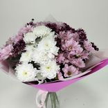 Букет из 15 кустовых хризантем в сетчатой белой и розовой упаковке — это настоящая сказка, заключенная в нежных лепестках. Хризантемы, словно маленькие солнечные огоньки, раскрываются в этой композиции, наполняя ее теплом и светом. Каждая хризантема, как маленькая звезда, добавляет яркости и веселья, а розовая пленка обвивает букет, словно легкая вуаль, создавая атмосферу утонченной нежности. Этот букет, как волшебный подарок, способен перенести в мир красоты и счастья, наполняя день светом и радостью.