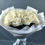 Букет из 19 белых роз в белой бумаге сочетает простоту и изящество. Белые розы символизируют чистоту и искренность, а их оформление делает композицию универсальной. Это подарок, который подчеркнет важность момента и оставит приятное впечатление.