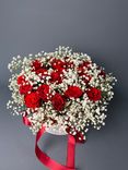 - Оформите заказ через сайт и выберите букет «21 красная роза и 6 белых гипсофил в белой коробке с красной лентой».