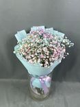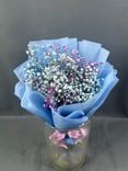 Букет цветов из 2 голубых и 1 фиолетовой гипсофилы в голубой пленке
