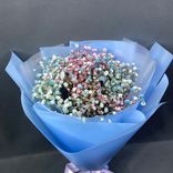 Букет из 2 голубых и 1 фиолетовой гипсофилы в голубой пленке — это как маленькое чудо, нежно воплощенное в цветах. Легкие облачка гипсофилы, как пушистые снежинки, парят в воздухе, создавая атмосферу волшебства. Голубые оттенки наполняют букет свежестью, а фиолетовая гипсофила добавляет нотки таинственности.