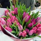 - 45 тюльпанов в сиреневых и малиновых оттенках — эффектный и пышный букет, который привлекает внимание.