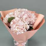 Букет из 5 розовых гортензий в розовой бумаге — это как мечта, обернутая в мягкость и свет. Розовые гортензии, с их крупными и бархатными лепестками, словно нежные облака, раскрываются в этом букете, наполняя его мягким сиянием. Розовая упаковка придает композиции еще больше элегантности и нежности, как легкий поцелуй на рассвете, когда мир только начинает пробуждаться. Этот букет волшебство, которое наполняет сердце теплотой и светом, даря ощущение легкости и покоя.
