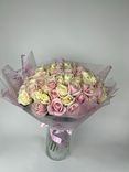 - Прозрачная пленка придает букете современный и легкий вид, подчеркивая красоту цветов.