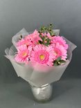 Очаровательная композиция из девяти розовых гербер и декоративных веточек писташа прекрасно дополняющих друг друга и, передающая чувство нежности и глубокой заботы.