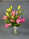 Лилии ассоциируются с изысканностью и уважением, поэтому такой букет уместен для самых разных ситуаций. Розовые оттенки выражают нежность и искренность, что делает его прекрасным выбором для романтического подарка. Композиция подойдёт для поздравления с юбилеем, годовщиной или днем рождения. Также она станет достойным жестом для выражения благодарности или поддержки.