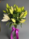 В этом букете собраны 11 белых лилий с крупными и нежными бутонами. Их естественная красота дополнена зеленью, которая придает композиции завершенность. Цветы оформлены в стильную упаковку, которая подчеркивает элегантный и лаконичный облик букета.