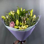 Пяти розовым лилиям достаточно, чтобы превратить любой день в особенный. Эти грациозные цветы, напоминающие о спокойствии и величии природы, создают удивительное впечатление своей красотой. Их нежно-розовые лепестки придают букету «Олимпия» изысканный и одновременно свежий облик.