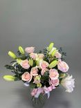- Романтичная гармония: Сочетание розовых лилий и белых роз создает атмосферу легкости и нежности, словно мир, полный поэзии и красоты.
