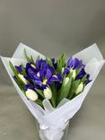 Букет из 15 тюльпанов и 14 ирисов в белой бумаге