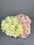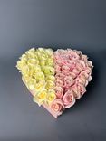 Цветы аккуратно размещены в стильной коробке в форме сердца и дополнены декоративной лентой, которая подчеркивает праздничный и подарочный характер композиции. Букет создан для признания в любви, поздравления с важным событием или элегантным сюрпризом.