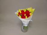 Букет из 17 желтых тюльпанов и 12 красных гвоздик в белой бумаге с лентой