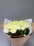Этот букет из белых роз в крафте станет великолепным символом ваших искренних чувств, который подчеркнет значимость любого события.