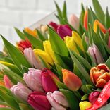 - Яркий микс тюльпанов разных оттенков, символизирующих радость, тепло и заботу