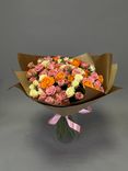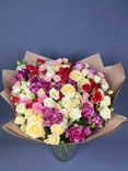 Яркое и разноцветное сочетание красоты и радости, наполненное энергией и весельем. Разноцветные розы белых, розовых, малиновых оттенков символизируют радугу эмоций и чувств: от страсти и любви до дружбы и уважения. Каждый цветок в букете уникален, как и каждая эмоция, которую он несет. Упаковка в крафте добавляет естественности и оригинальности, подчеркивая красоту и разнообразие цветов.