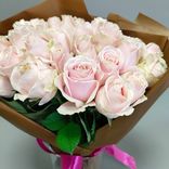 Розовые розы символизируют благодарность, уважение и тонкие чувства. Они подходят для выражения искренних и теплых эмоций, при этом каждая роза в букете несет свою особую символику — восхищение и признание. Крафт и лента добавляют букету естественности, придавая ему еще большее очарование.
