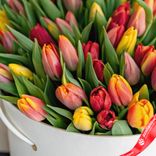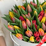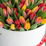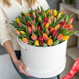 Букет из 47 тюльпанов сочетает в себе энергию и тепло весеннего настроения. Контрастные оттенки создают живой и выразительный акцент, а минималистичная белая коробка делает композицию особенно стильной. Такой букет подойдет как для подарка любимому человеку, так и для поздравления с торжественным событием.