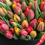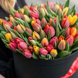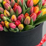 Изящный букет из пленительных тюльпанов в черной коробке. Такая уникальная композиция станет поистине памятным сюрпризом для тех, кто дорог вашему сердцу, оставляя след ярких впечатлений на долгое время.