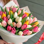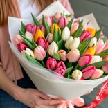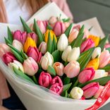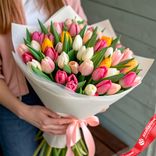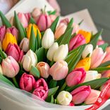 - В букете собраны свежие тюльпаны насыщенных и пастельных оттенков, создающих гармоничный контраст
