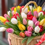 Яркий и жизнерадостный букет из 47 разноцветных тюльпанов — воплощение весеннего настроения и праздника. Микс оттенков создает гармоничную палитру, где каждый цвет символизирует радость, любовь и вдохновение. Композиция оформлена в изящной плетеной корзине.