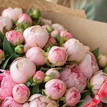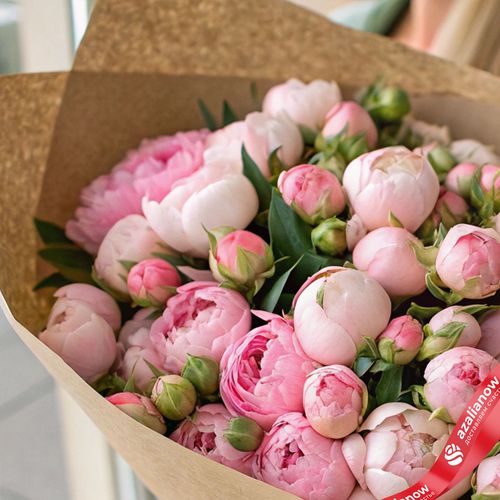 - Крафтовая упаковка — придает композиции теплый и натуральный вид, который прекрасно сочетается с яркими пионовыми цветами.