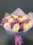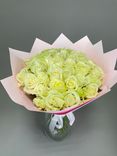 - Розовая пленка усиливает нежный образ букета.