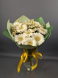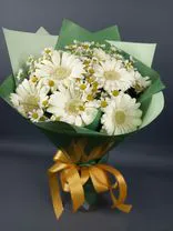 Букет «Шарм летнего сада» — это легкость, свежесть и солнечное настроение в каждом цветке. Нежные ромашки и изысканный танацетум, создают ощущение уюта и природной гармонии. Этот букет словно переносит в утро летнего дня, наполненное ароматом трав и щебетом птиц. Простота ромашек напоминает о детстве, искренности и радости, а миниатюрные соцветия танацетума добавляют композиции глубину и природную естественность. Оформление в зеленую пленку подчеркивает натуральность букета и делает его особенно трогательным.