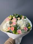 Нежный и воздушный букет, в котором сочетаются классические розы, изысканные гвоздики и пышные гортензии. Легкая пленка делает композицию еще более утонченной, позволяя цветам раскрыться во всей своей красоте.