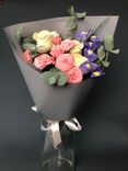 Розы олицетворяют любовь и страсть. В букете они представлены в мягких розовых и желтых тонах. Розовая роза, благодаря своей нежности и утонченности, часто ассоциируется с любовью и истинной привязанностью. В то время как желтая роза олицетворяет дружбу, счастье и радость.