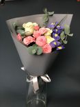 Букет оформлен в серую пленку, которая позволяет цветам максимально раскрыть свою естественную красоту и оттенки. У стеблей цветы перехвачены атласной лентой. Высота букета — 50 см. Такой букет будет легко поместить в стандартную вазу, он не составит хлопот.