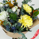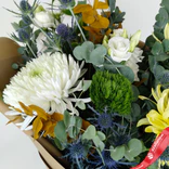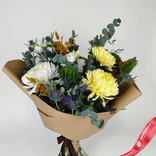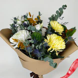 Букет любимому «Мужская гармония» — это стильная композиция с уверенным характером. В основе букета — хризантемы белых и желтых оттенков, благородная эустома и фактурный эрингиум, дополненные декоративной зеленью.