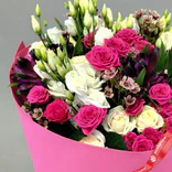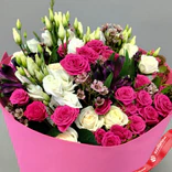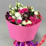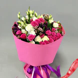 Букет «Малиновый рассвет» из кустовых роз, ваксфловера, лизиантуса и альстромерии
