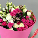 Букет «Малиновый рассвет» — яркая композиция, наполненная энергией цвета и нежностью живых цветов. В центре внимания — насыщенные кустовые розы малинового оттенка, которые сочетаются с воздушными лизиантусами, изящными альстромериями и деликатным ваксфловером.