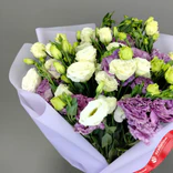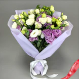 Букет из 19 лизиантусов в сиреневой упаковке — это изящная и утонченная композиция, сочетающая нежные кремово-белые и лиловые оттенки. Бархатистые лепестки лизиантусов с волнистыми краями создают ощущение легкости и воздушности, а бутоны разной степени раскрытия придают букету естественный и живой вид.