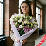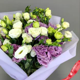 Сиреневая матовая упаковка подчеркивает цветочную палитру и гармонично завершает образ композиции. Белая атласная лента добавляет аккуратный акцент и делает букет праздничным. Такой подарок подойдет для дня рождения, юбилея, признания в чувствах или просто как знак внимания без повода.