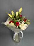 - Яркая палитра: Розы и лилии представлены в необычных сочетаниях цветов, что делает каждый букет уникальным.