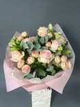 Букет из роз, гвоздик, левкадендрона «Гипноз»
