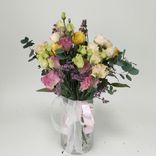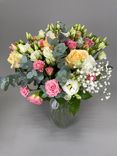 - Элегантность: Идеальное сочетание роз и лизиантусов придает букету утонченный вид.