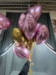 - Шары: Составляет основу композиции 12 воздушных шариков в форме сердца, наполненных гелием. Они представлены в нежных цветах: нежно-розовом, золотом и бежевом. Перевязаны изящной лентой, создающей эффект воздушности и праздника.