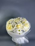 - Яркое и элегантное сочетание роз, фрезий и хризантем создает букет, который привлекает внимание и дарит радость.