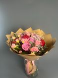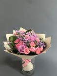 В состав букета вошли кустовые и обычные розы, голландские гвоздики, очаровательный кустарник ваксфловер и зелень - милый дополнительный элемент.