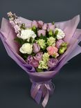 Букет из гвоздик, роз, лизиантусов и маттиолы «Нежное наслаждение» — это волшебная композиция, которая, словно ласковая мелодия, наполняет мир вокруг теплом и светом. Нежные розы, элегантные гвоздики, изысканные лизиантусы и чарующая маттиола создают атмосферу сказочного уюта и гармонии. Этот букет, как мечта, воплощает собой изысканность, тонкость и красоту, превращая каждый момент в магическое переживание. Он словно поцелуй весны, где цветы соединяются, чтобы дарить радость и вдохновение.