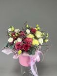 - Романтический акцент: сочетание роз, маттиолы, лизиантуса и гиперикума создает уникальную гармонию, в которой каждый цветок раскрывает свою неповторимую красоту.