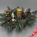 Композиция изготовлена из высококачественных материалов. Натуральные еловые ветви сохраняют свой декоративный вид в течение долгого времени. Свеча выполнена из качественного воска, устойчивого к растрескиванию, а декоративные элементы покрыты стойким блестящим напылением, которое не осыпается.