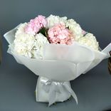 В составе этого пышного букета — 19 гортензий, белых и розовых. За счет нежности этих цветов создается баланс с объемом и сохраняется визуальная легкость.
