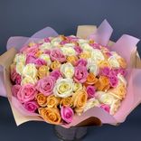 Огромный шикарный букет из 101 розы – это настоящий шедевр флористики. В нем собраны розы четырех оттенков: белые, малиновые, розовые и фиолетовые. Каждая роза выращена в России и имеет длину стебля 50 см, что придает букету особую пышность и объем.