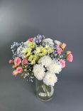 Букет из хризантем, роз и гипсофил «Розовое блаженство»