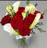 Перед вами букет из десяти белых калл и девяти красных роз — классическое сочетание цветов для выражения глубоких чувств любви, привязанности, страсти.